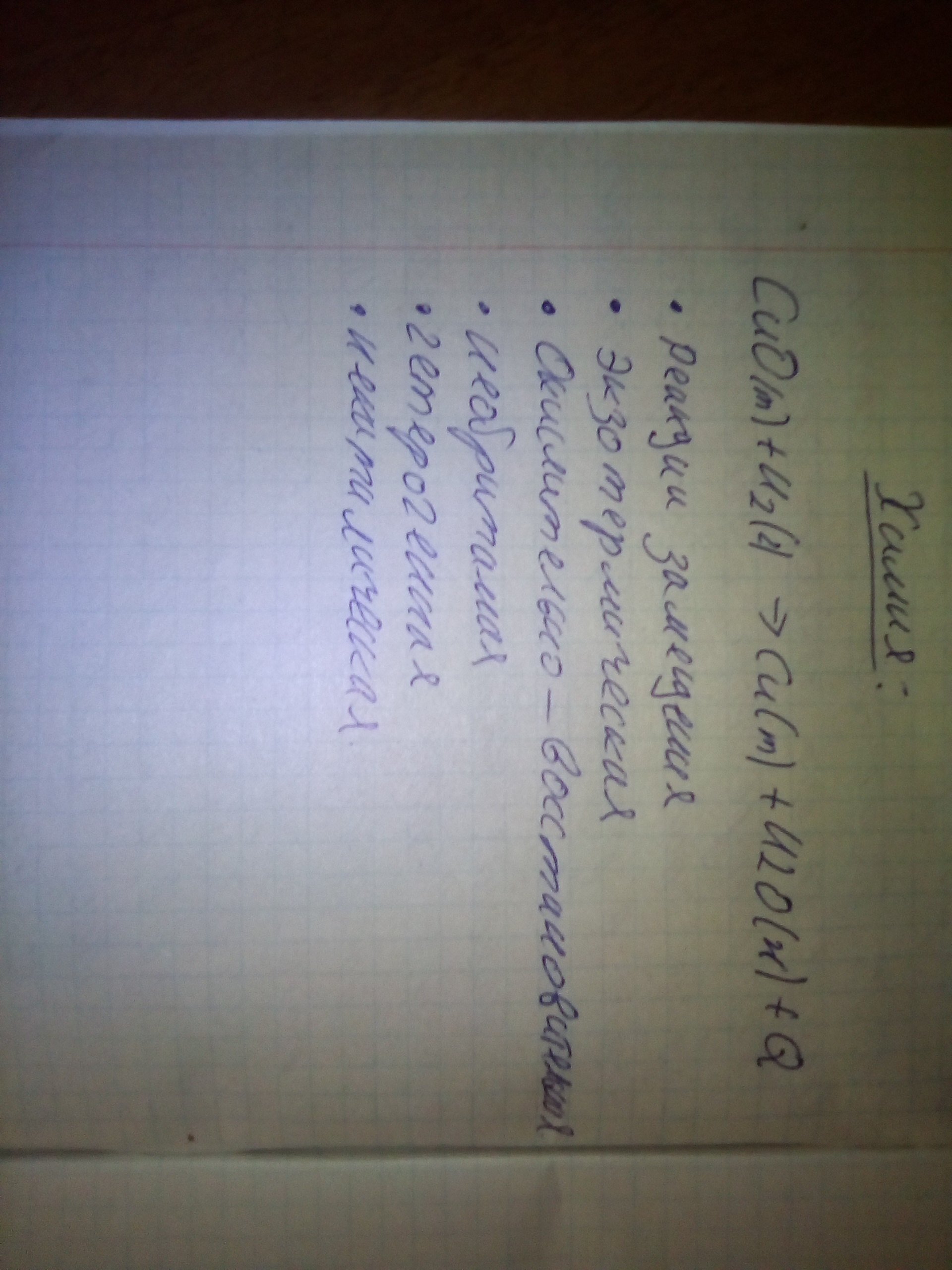 CuO(т) + Н2(г) -> Cu(т) + Н2О(ж) +Q