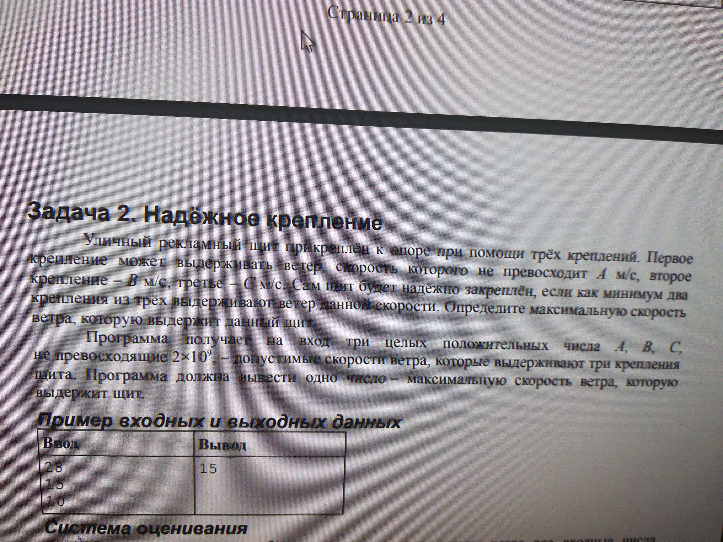 if ((a > b) and (a < c)) or ((a < b) and (a > c)) or ((a<b) and (b=c)) or ((a<b) and (a=c)) or ((a<c) and (a=b)) then writeln(a)