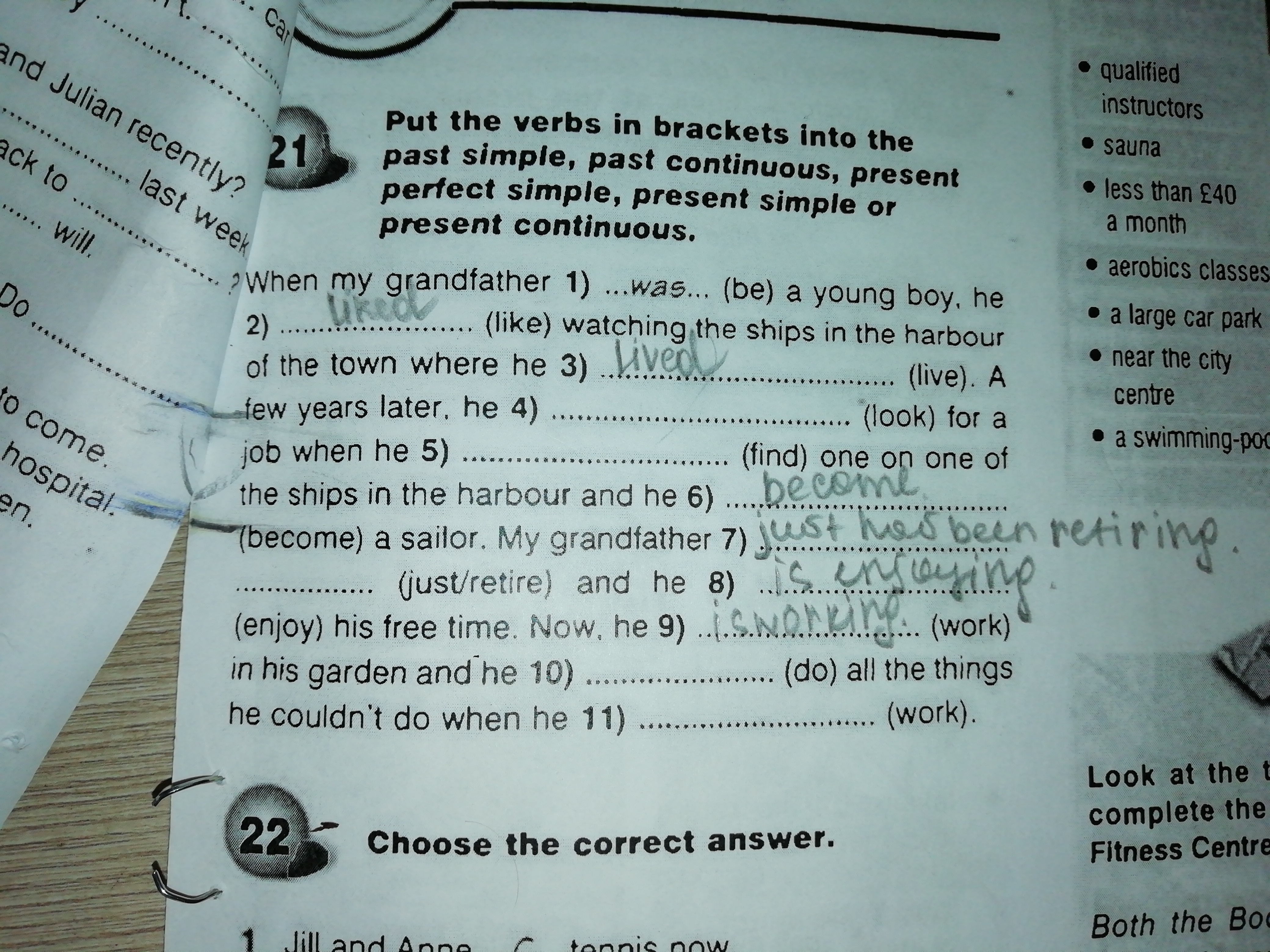 2 liked 3 lived 4 was looking 5 found 6 became 7 has just retired 8 enjoys/is enjoying 9 works 10 does 11 worked/was working