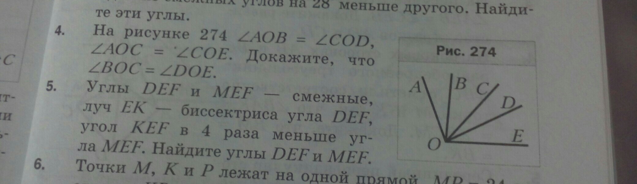 на рисунке 274 угол AOB= углу COD, угол АОС= углу COE. Докажите, что угол BOC=DOE