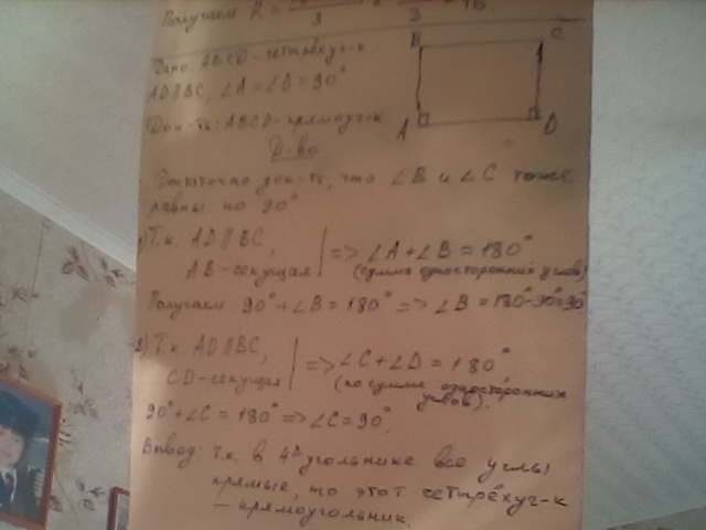 Докажите что четырехугольник, у которого две стороны параллельны и углы, прилежащие к одной из этих сторон, прямые,является прямоугольником.