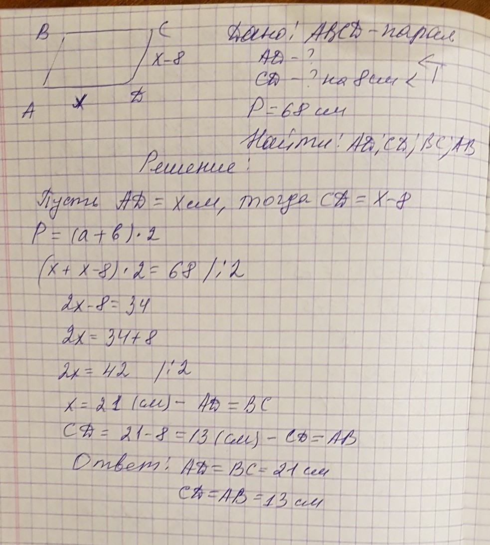 периметр параллелограмма равен 68 см. одна из его сторон на 8 см меньше другой. найдите длинны сторонпареллелограмма