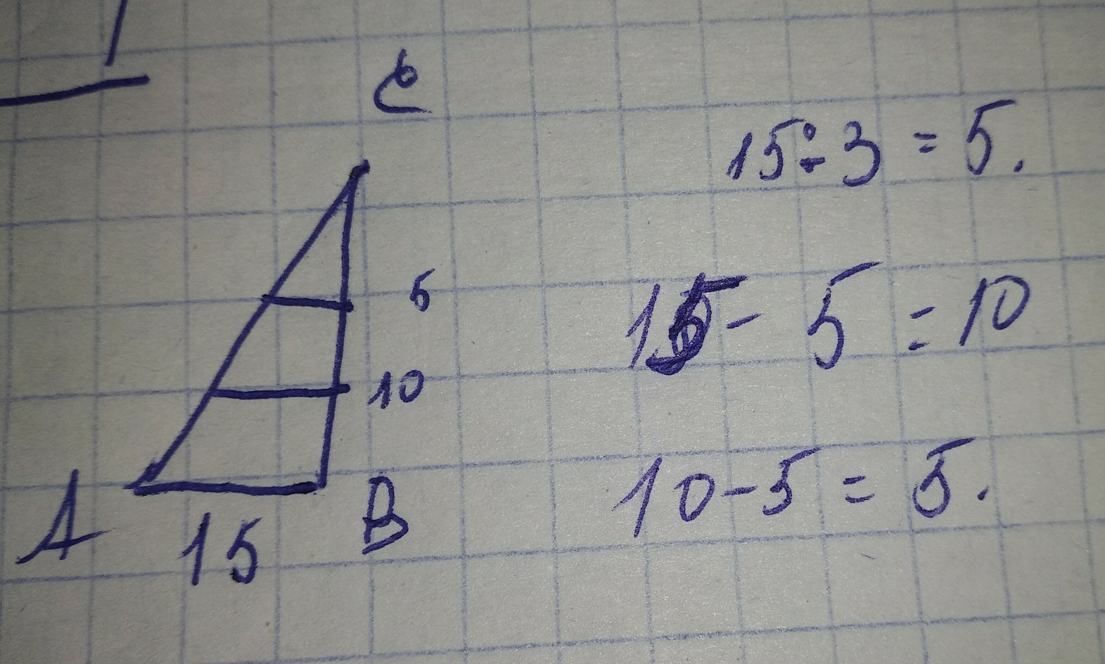 Сторона АВ треугольника АВС равна 15 см. Сторона ВС разделена на 3 равные части И через точки деления проведены прямые паралейные стороне АВ Найдите длины отрезков этих прямых, содержащихся мужду сторонами треугольника.