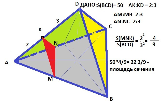 ассыГеометрия 19 баллов Через точку к на ребре ad тетраэдра dabc проведено сечение параллельно грани bcd. площадь грани bcd равна 50, ak:KD равна 2:3. Найдите площадь сечения