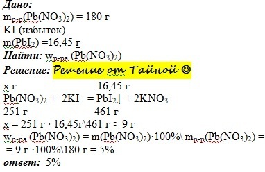 При взаимодействии 180 г раствора нитрата свинца с небольшим избытком раствора иодида калия выпало 16,45 г осадка. Рассчитайте массовую долю нитрата свинца в исходном растворе.