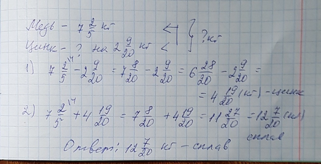 сплав меди и цинки содержит 7 целых 2/5 кг медии, а цинка на 2 целых 9/20 кг меньше. Какого масса сплава