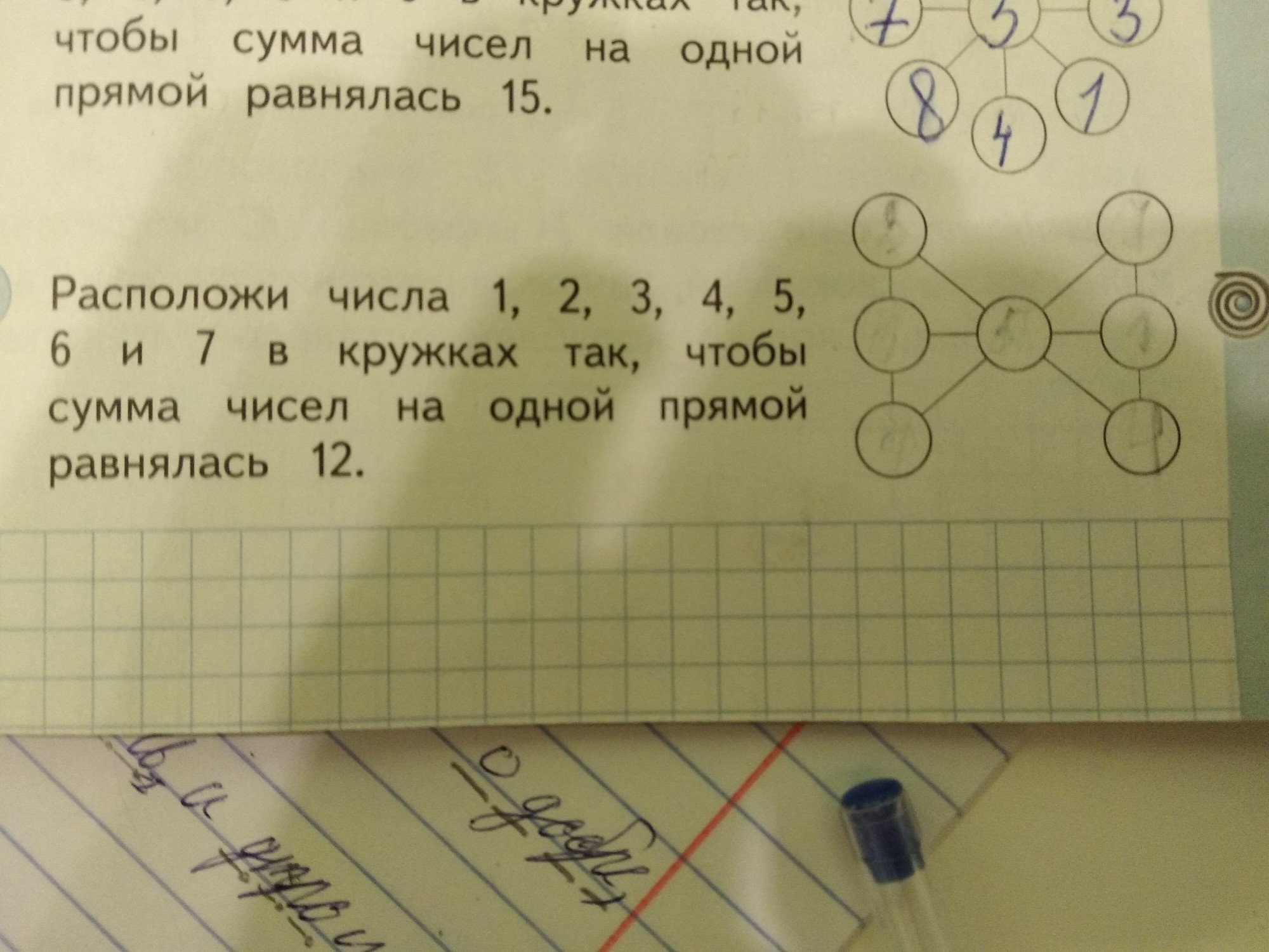 Расположи числа 1,2,3,4,5,6,7в кружках так,чтобы сумма чисел на одной прямой равнялась 12.