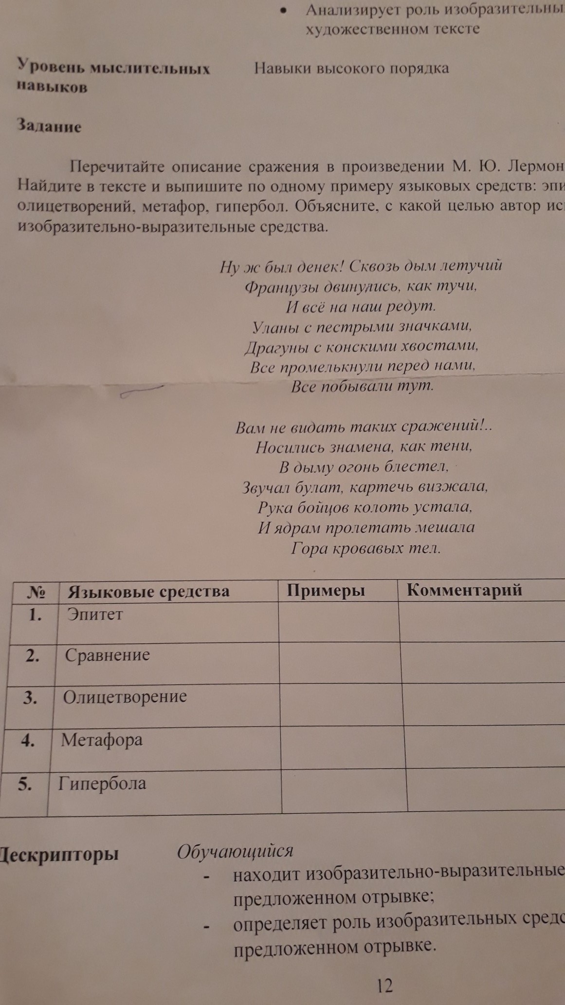 Французы двинулись как тучи (сравнение) помогает увидеть большие силы врага.Гора крававых тел(гипербола) помогает узнать сколько было убитых тел.Звучал булат(олицетворение)помогает узнать какой был шум.Ночна пала тень(метафора) наступила тень.Насились знамёна (эпитет)