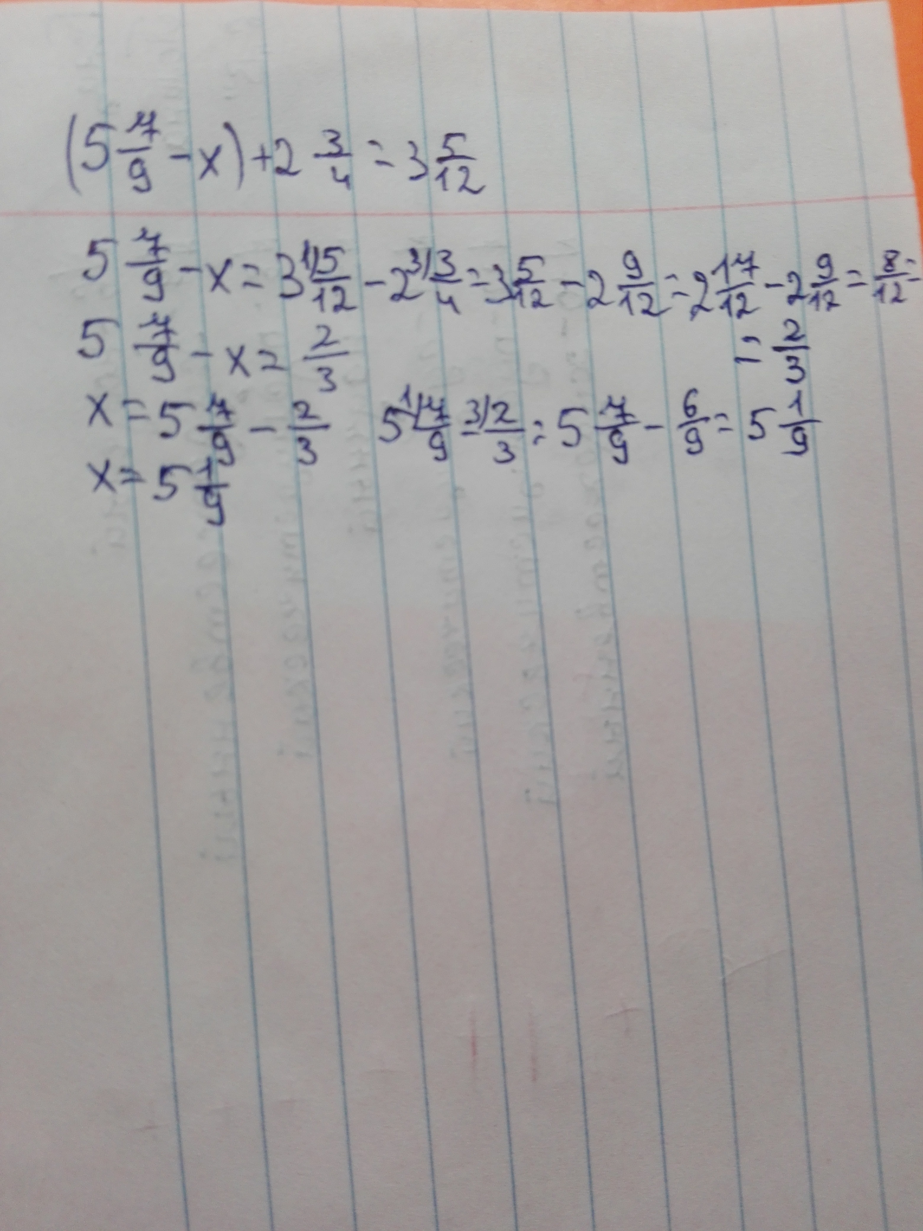 (5 целых 7/9 - х)+2 целых 3/4=3 целых 5/12