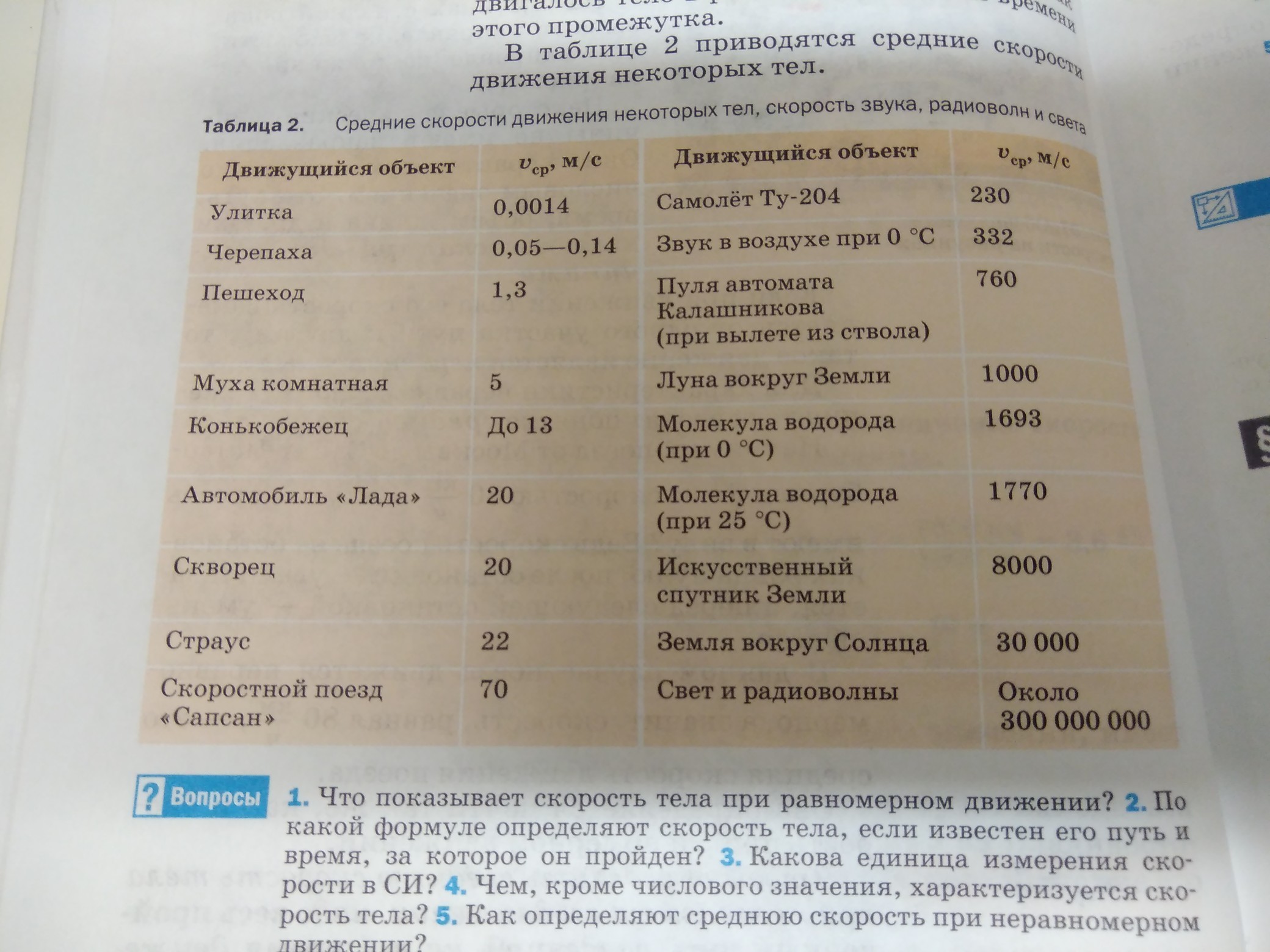 Пользуясь таблицей 2 Найдите скорости страуса автомобиля искусственного спутника Земли Определите пути пройденные ими за 5 секунд
