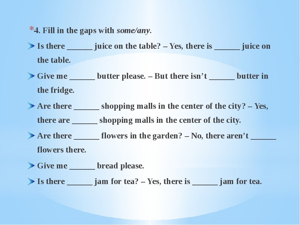 1 some/ no 2 any 3 some 4 any 5 any 6 some 7 some/ no 8 some