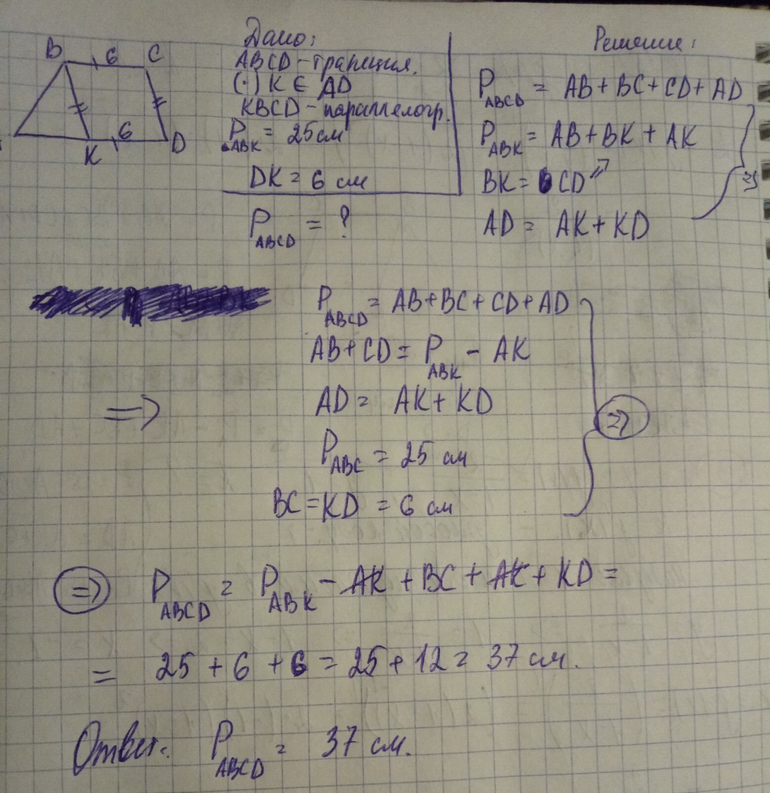 1. В трапеции ABCD, AD и BC - основания, AD > BC. На стороне AD отмечена точка K так, что KBCD - параллелограмм. Периметр треугольника ABK равен 25 см, DK = 6 см. Найдите Периметр Трапеции.