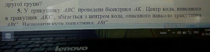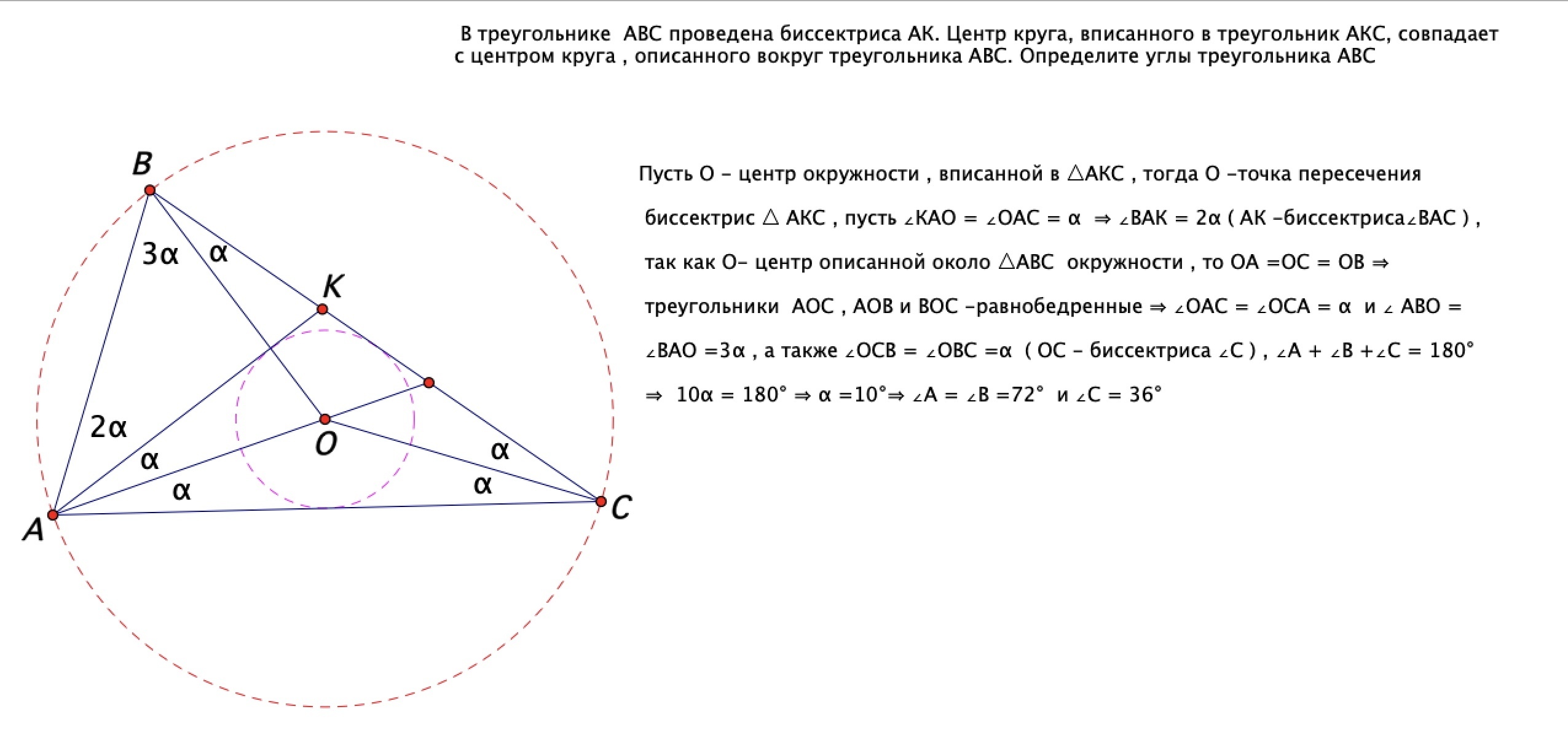 У трикутника АВС проведена бісектриса АК. Центр кола, вписаного в трикутник АКС, збігається з центром кола , описаного навколо трикутника АВС. Визначте кути трикутника АВС