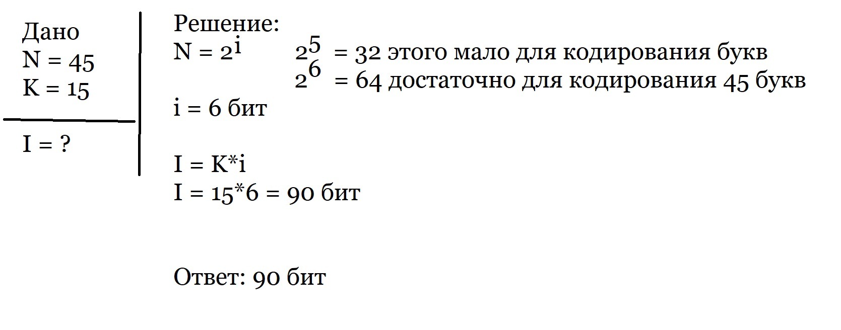 У племени " Весельчаки" в алфавите 45 символов. Сколько бит информации будет нести в себе слово, состоящее из 15 букв ? ( Как решать ?)