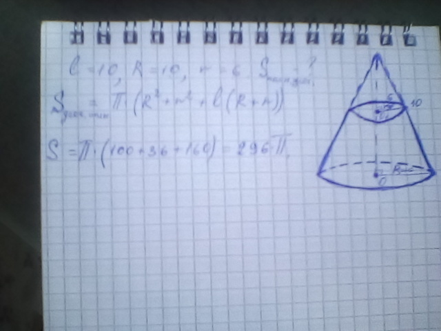 Найдите поверхность усеченного конуса, учитывая, что радиусы его оснований равны 6 см см и 10 см, а образующая - 10 см.
