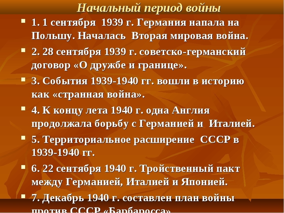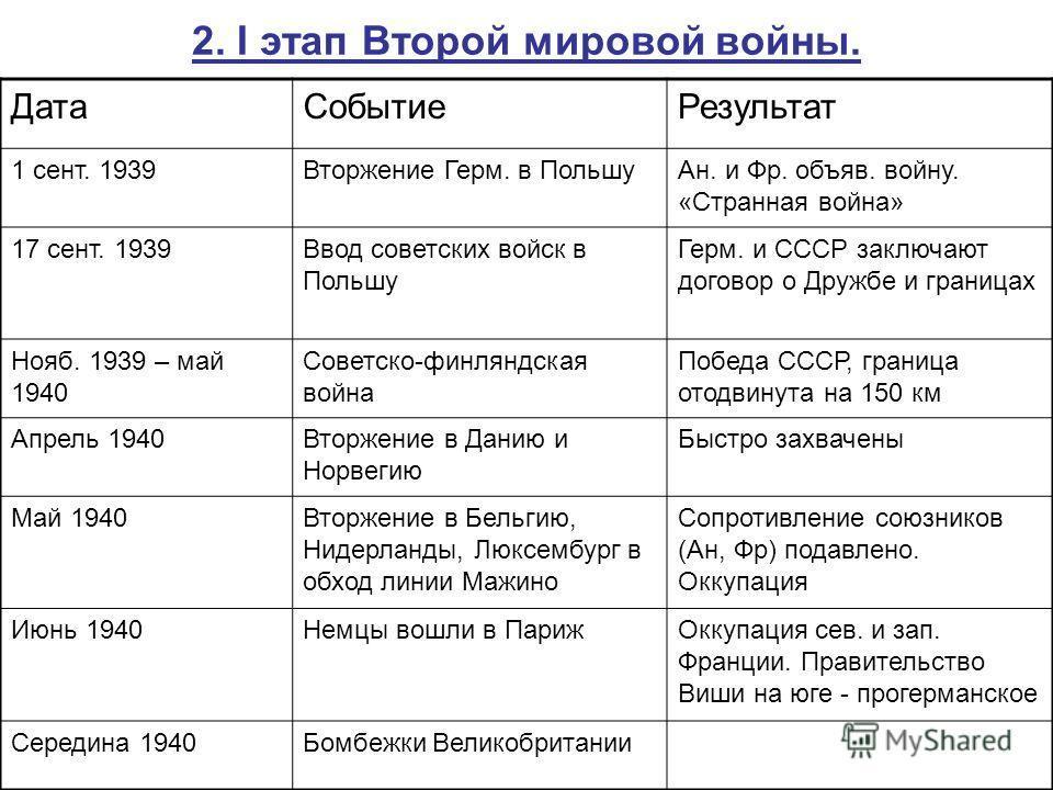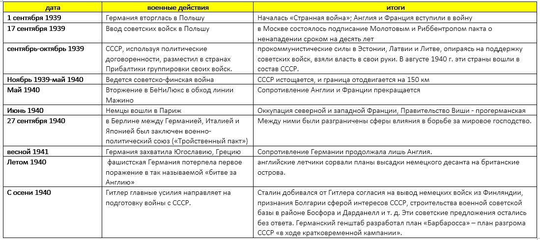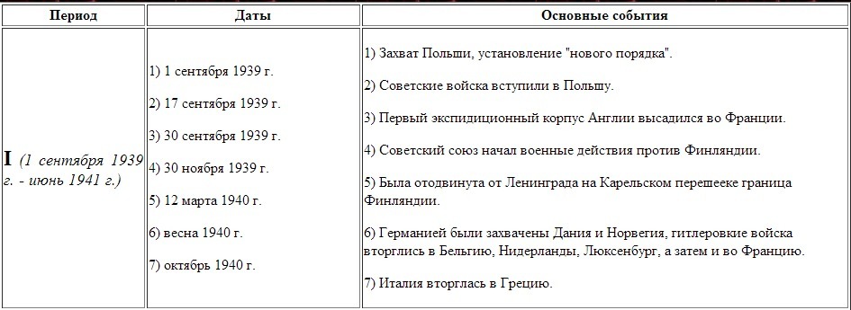 Таблицу "Начальный период второй мировой войны" можно составить так: