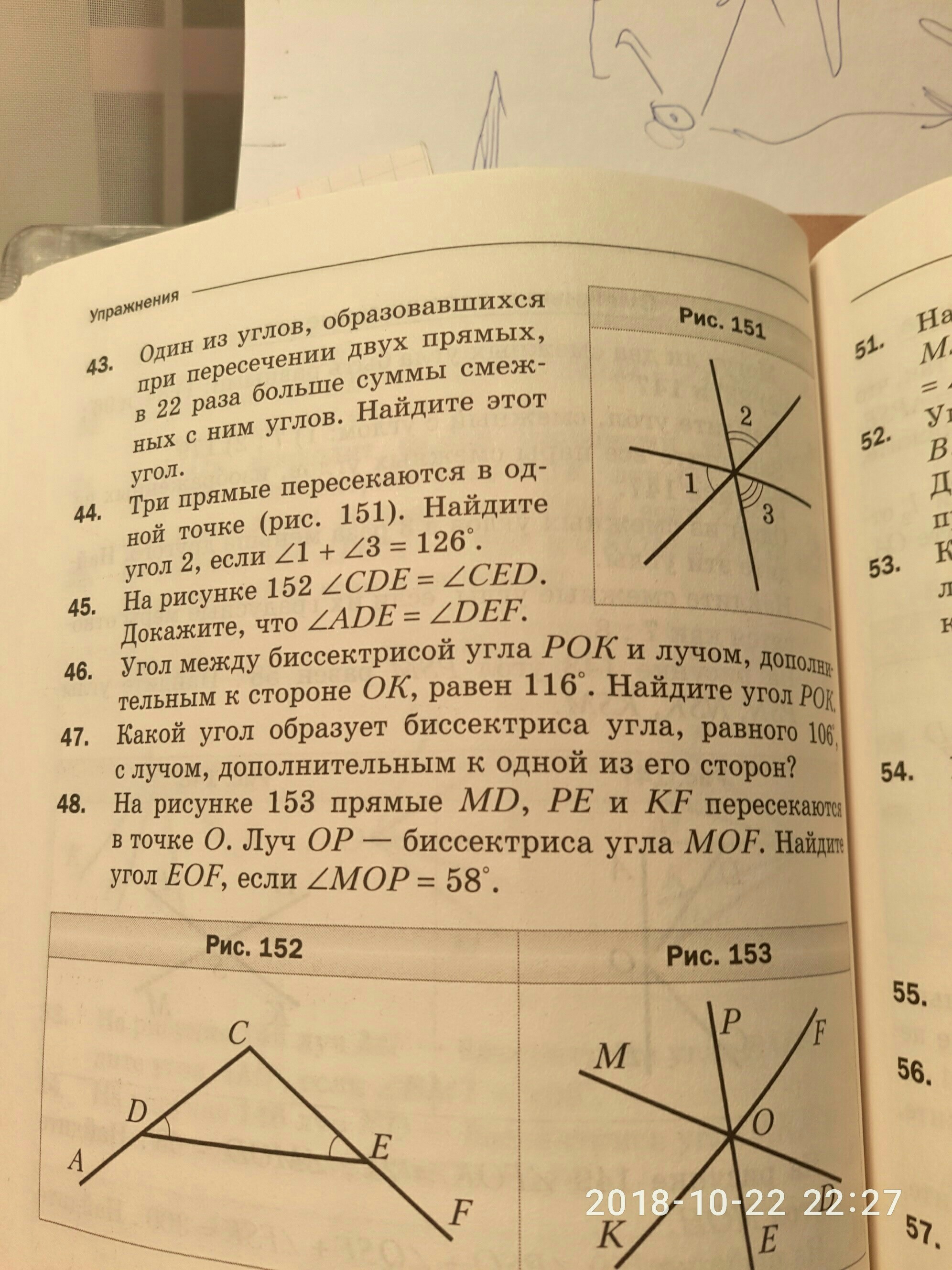 Пусть х-маленький угол. Тогда 22(х+х)-второй угол. 22(2х)+х=180.