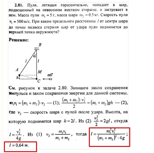 Пусть L - длина стержня, M=0,5 кг - масса шара и m=0,005 кг- масса пули, v =500 м/с - скорость движения пули. Шар с пулей поднимутся до верхней точки окружности, то есть на высоту h=2*L, при условии, что потенциальная энергия шара с пулей в верхней точке E1=(M+m)*g*2*L будет равна их кинетической энергии E2=(M+m)*v1²/2 в нижней точке. Скорость v1 определим из закона сохранения импульса: m*v=(M+m)*v1, откуда v1=m*v/(M+m)=0,005*500/(0,505)≈4,95 м/с. Из равенства 2*(M+m)*g*L=(M+m)*v1²/2, или 2*g*L=v1²/2 находим L=v1²/(4*g). Полагая g≈10 м/с², окончательно получаем L≈(4,95)²/40≈0,61 м. Ответ: L≈0,61 м.