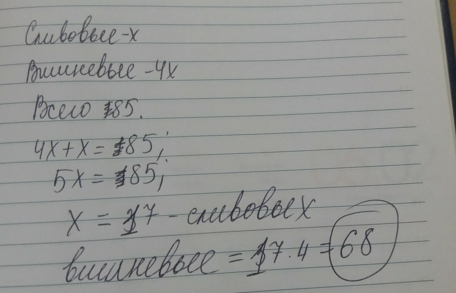 в саду 85 вишневых и сливовых деревьев .число вишневых 4 раза больше чем сливовых. сколько вишневых деревьев?