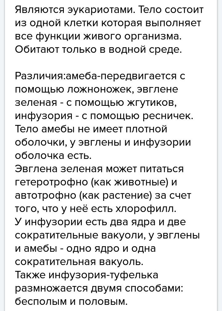 Различия: у инфузории 2 ядра, у эвглены одно; эвглена передвигается с помощью жгутика, инфузория при помощи ресничек и т.д