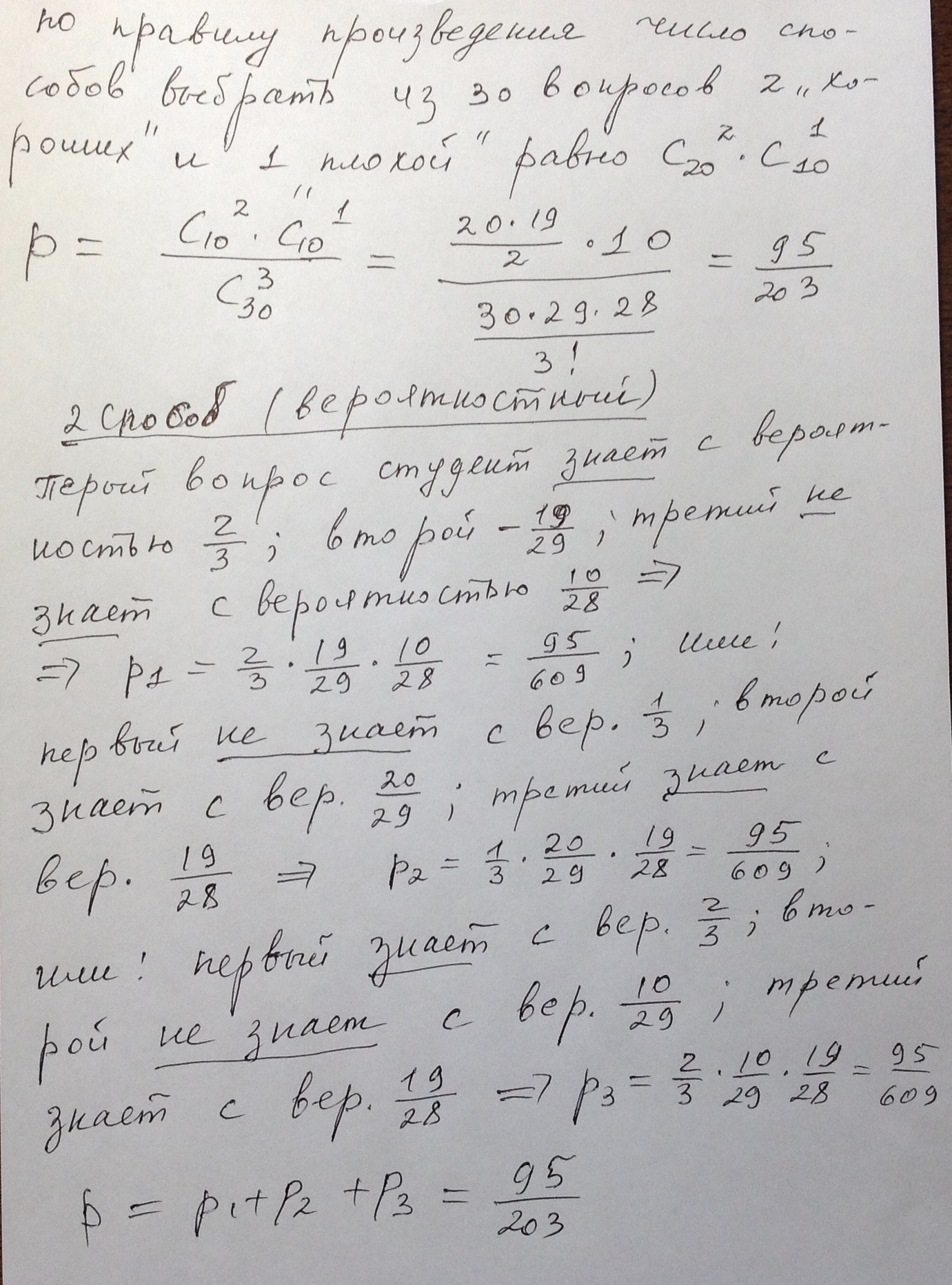 Студент знает 20 вопросов из 30. Какова вероятность того, что он получит "отлично" ответив на все 3 вопроса билета? Какова вероятность получения оценки "удовлетворительно" если для этого надо ответить на 2 вопроса?