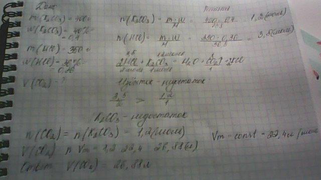 Вычеслите объем газа, который образуется при сливании 400г. 40%-ного раствора карбоната калия и 350г. 36%-ного раствора соляной кислоты