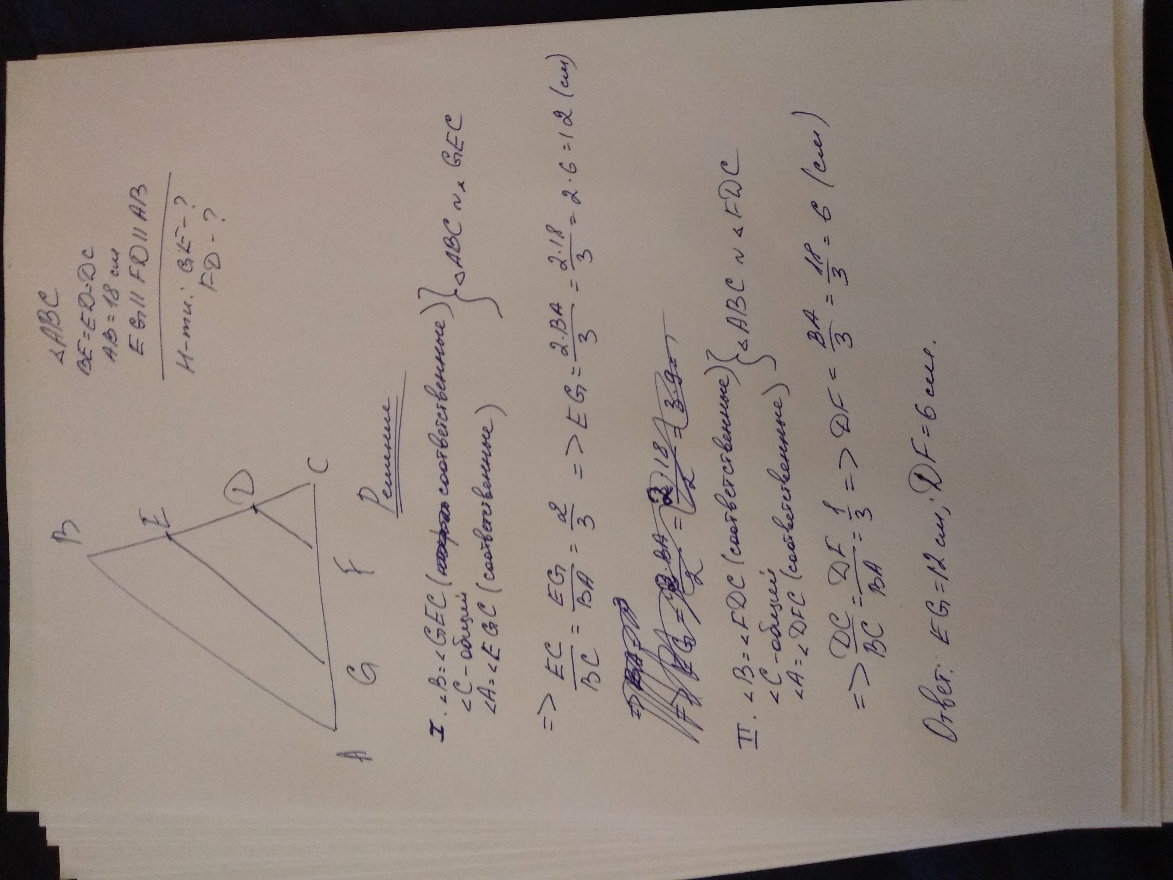 Сторона AB треугольника ABC равна 18 см. Сторона BC разделена на 3 равные части и через точки деления проведены прямые, параллельные стороне AB. НАЙДИТЕ длины отрезков этих прямых, содержащих между сторонами треугольника
