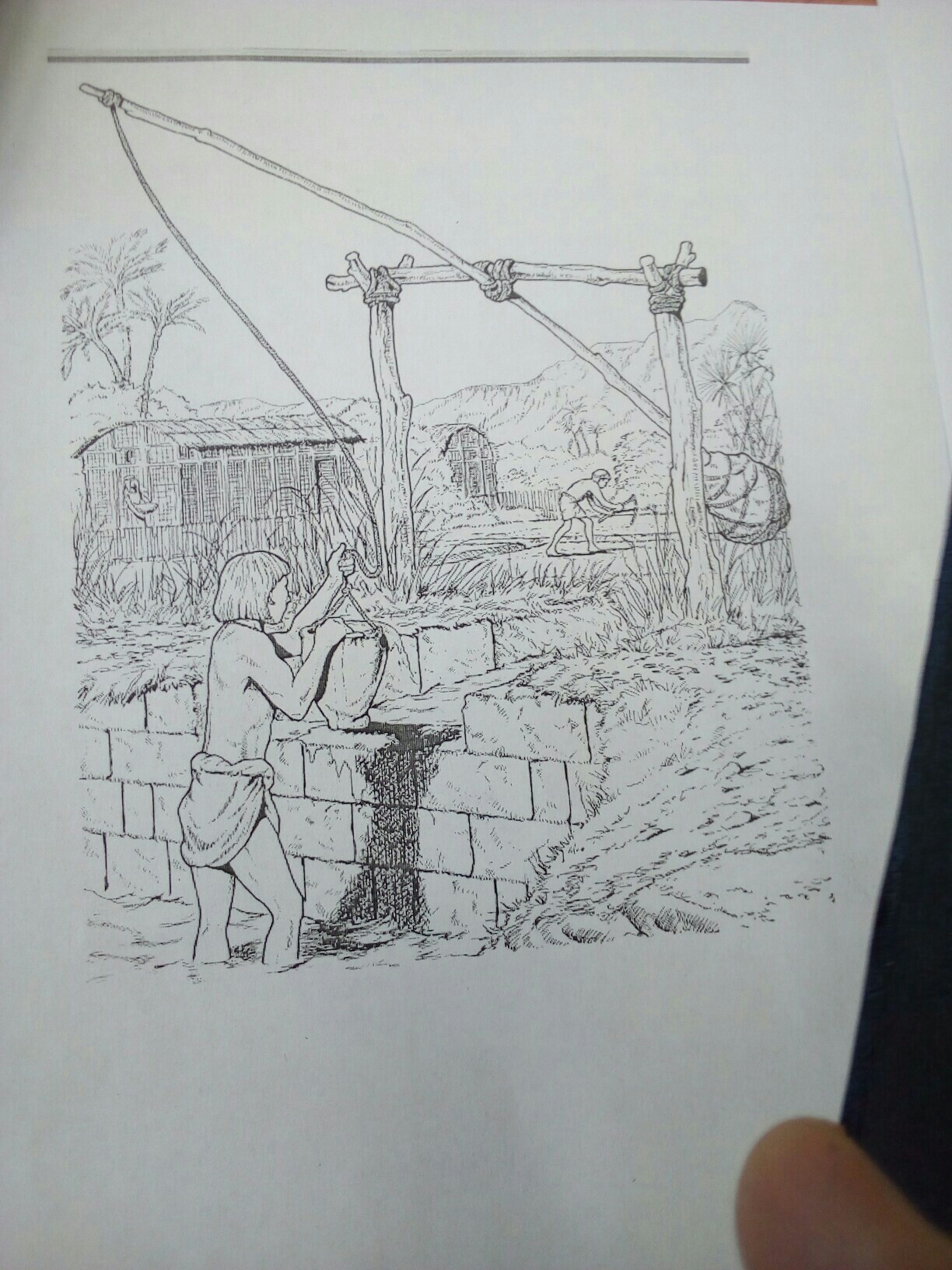Люди занимались дела. видно как девушка набирает воду из реки. На заднем плане видно как мужик
