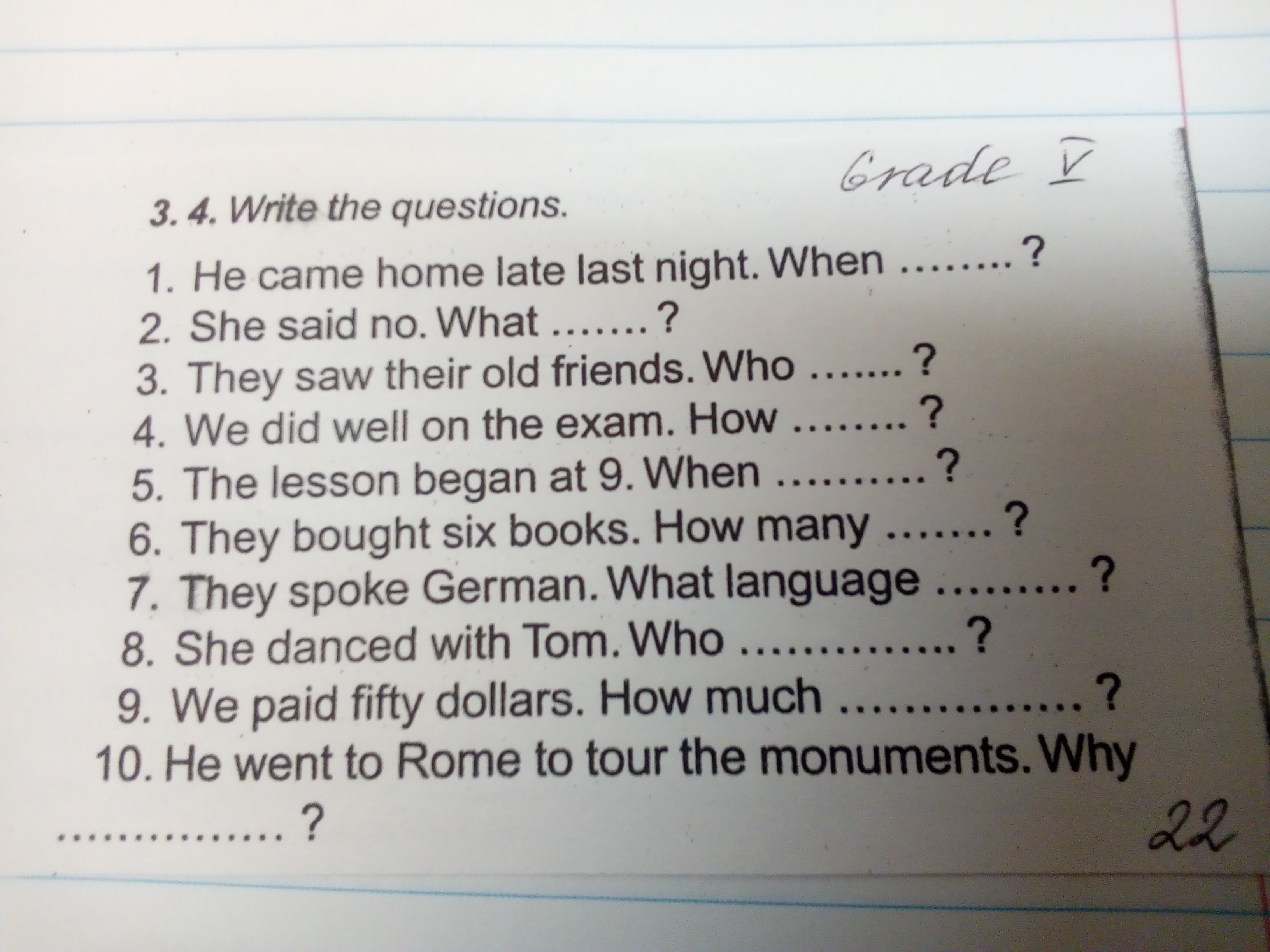 1. When he came? 2. Who saw their old friends? 3. What she said? 4. How we did the exam? 5. When the lesson began? 6. How many books they bought? 7. What language they spoke? 8. Who danced with Tom? 9. How much dollars we paid? 10. Why we went to Rome?