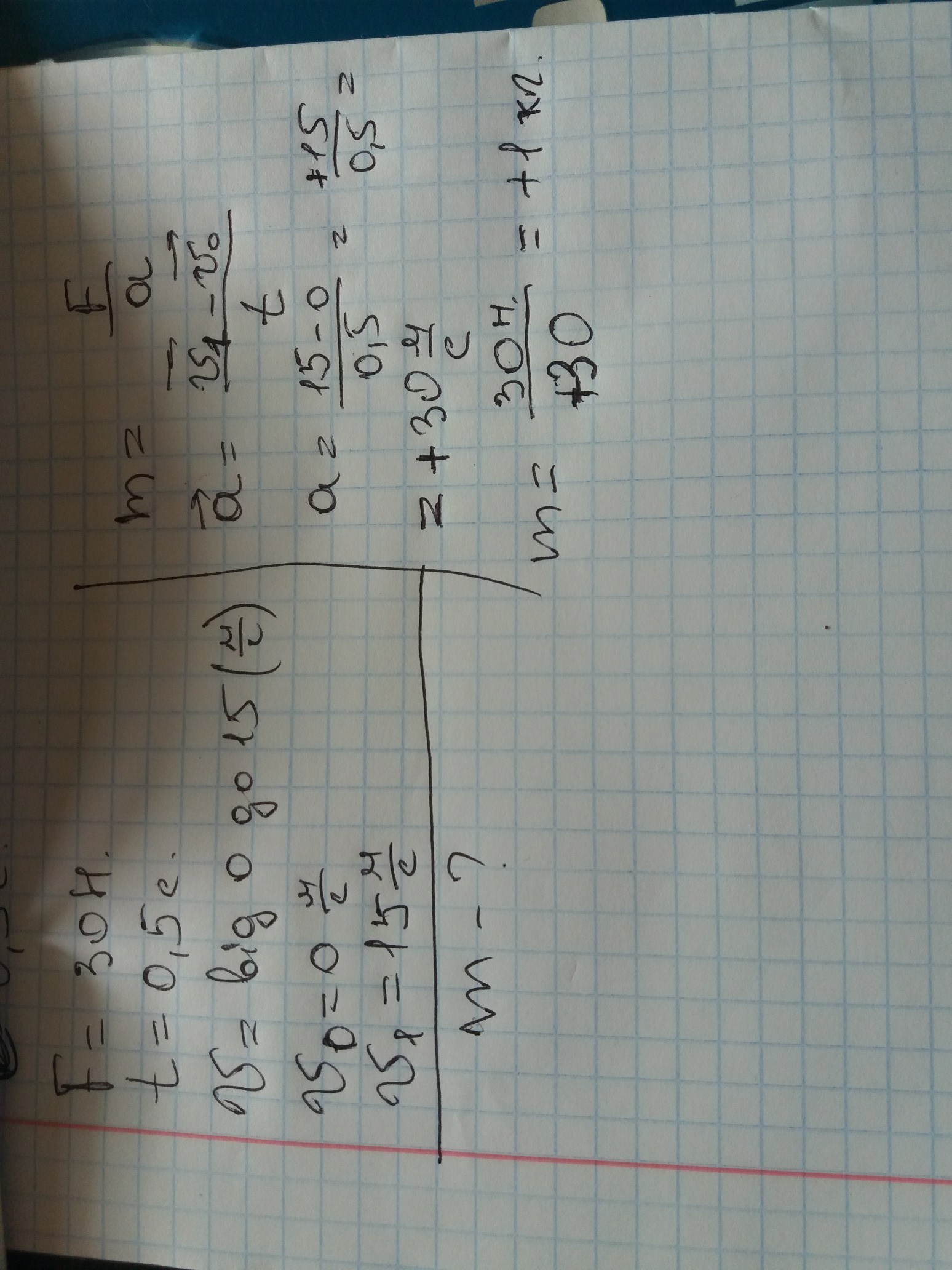 под действием постоянной силы 30 Ньютонов скорость камня за 0,5 секунд увеличилась от 0 до 15 метроа в секундк Вычислите массу камня