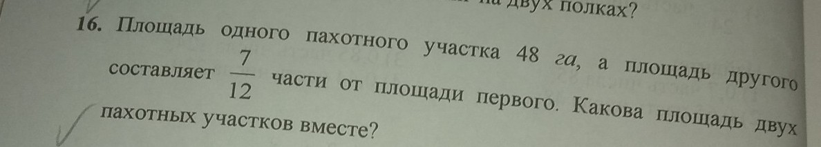 1) 48 га * 7/12 = 48 : 12 * 7 = 28 га площадь второго поля