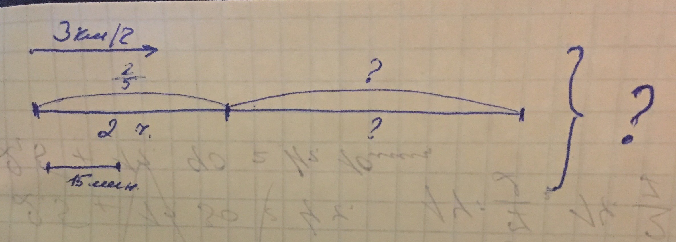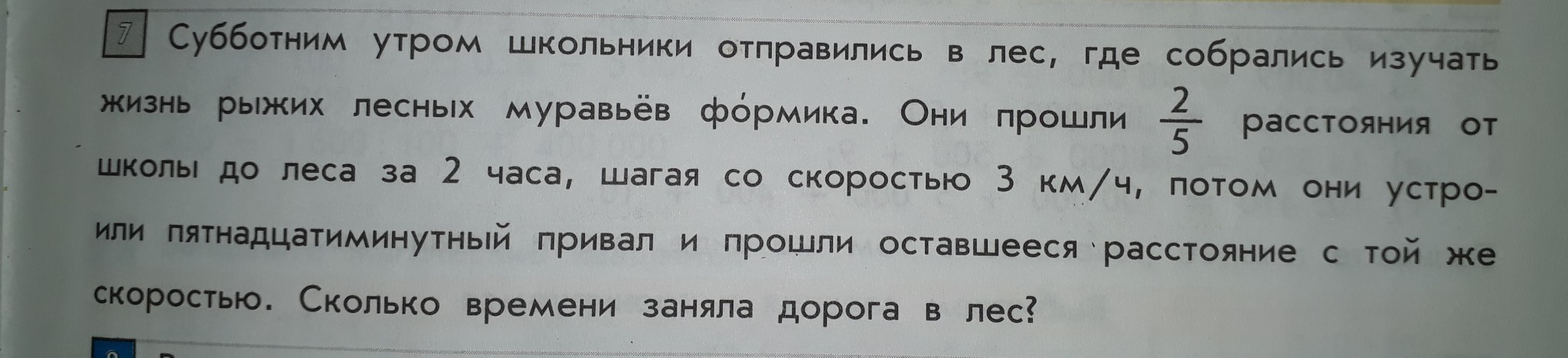 Схема внизу на фото. Решение: 1) 3*2=6(км) 2/5 расстояния. 2) 6:2/5=15(км) все расстояние 3)15-6=9(км) оставшееся расстояние 4) 9:3=3(ч) на остаток пути 5)2+3=5(ч) шли 6) 5ч+15мин=5 ч 15 мин всего. Ответ:5 ч 15 мин заняла дорога в лес.