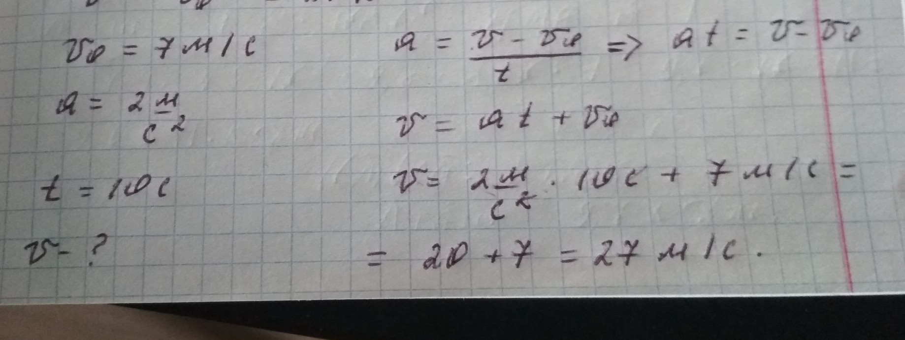 Лыжник начал скатываться с горы имея скорость 7м/с под действующем ускорением 2м/с2. Какую скорость будет иметь лыжник в конце горки если он скатывается с неё в течение 10 секунд