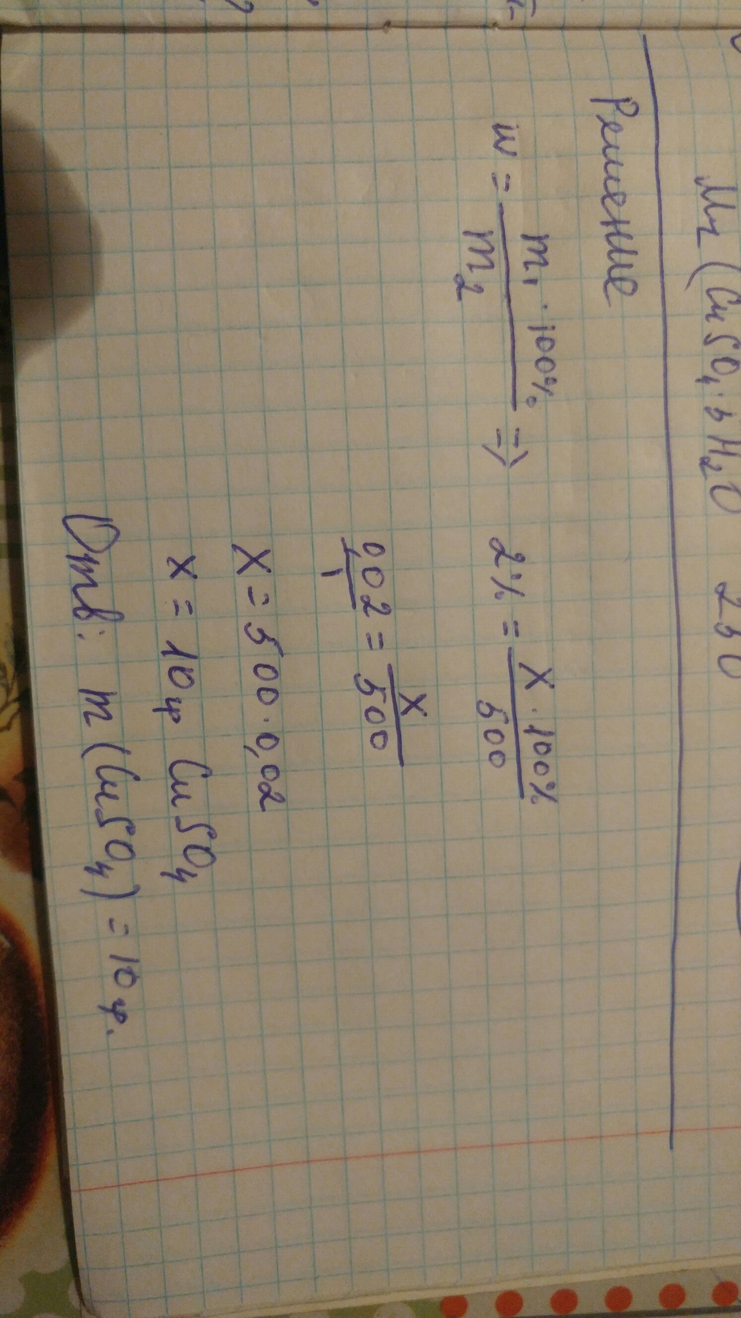 определите массу раствора с массовой долей сульфата меди двухвалентной, которой потребуется для приготовления раствора массой 500 г с массовой долей CuSO4 2%.