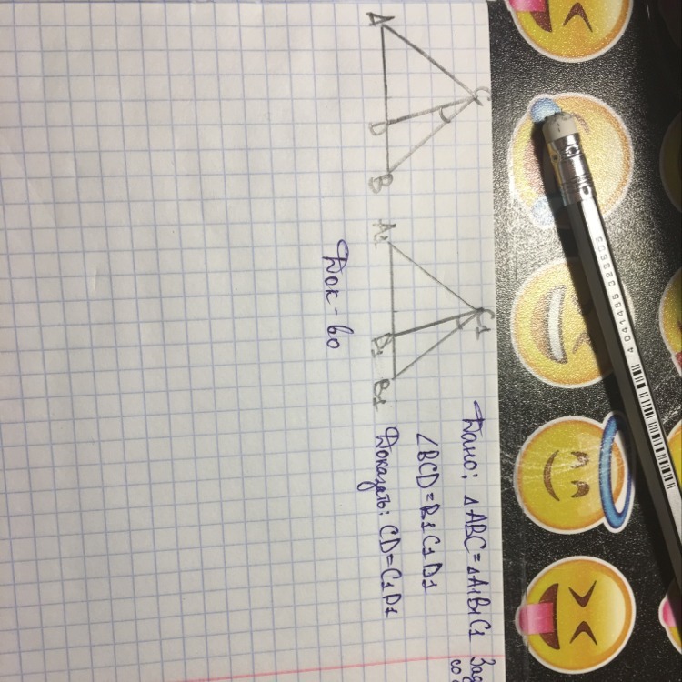 треугольники ABC=A1B1C1( по усл задачи), значит угол B=углу B1, по этому треугольники BCD=B1C1D1(по 2 признаку треугольника).значит сторона CD=C1D1(поскольку треугольники равны по 2 признаку)