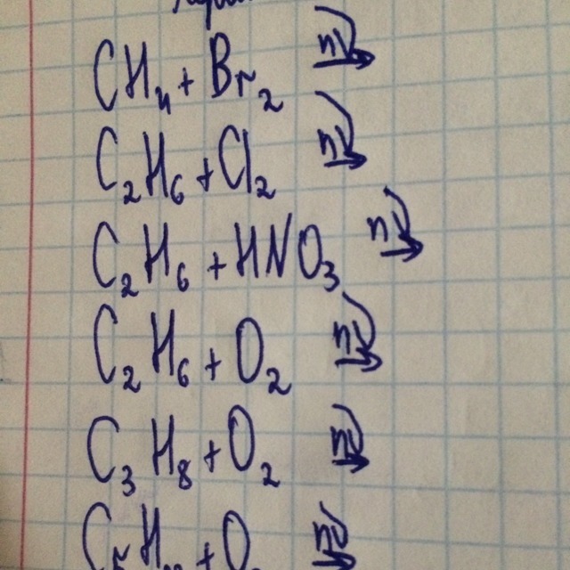 1) CH3Br +HBr 2) C2H5Br+HBr 3) C2H5NO2+H2O 4) 2C2H6+5O2= 4CO2+6H2O 5) и 6) так же, как четвертое, только уравняй.