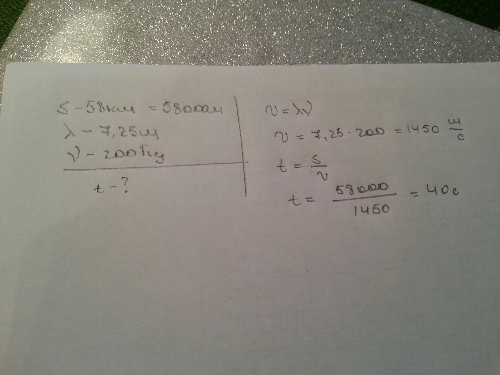 За какое время звуковая волна распространится в воде на расстояние 58 км, если длина волны 7, 25 м, а частота колебания 200Гц?