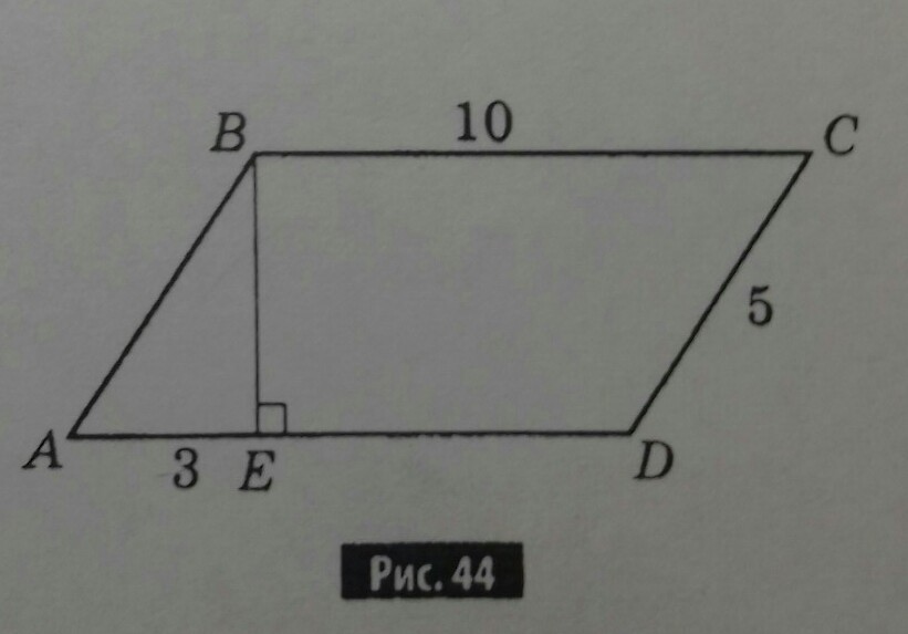 на рис 44 АВСD - параллелограмм, ВЕ перпендикулярно АD, АЕ=3см,СD=5cм, ВС=10см найдите S abcd