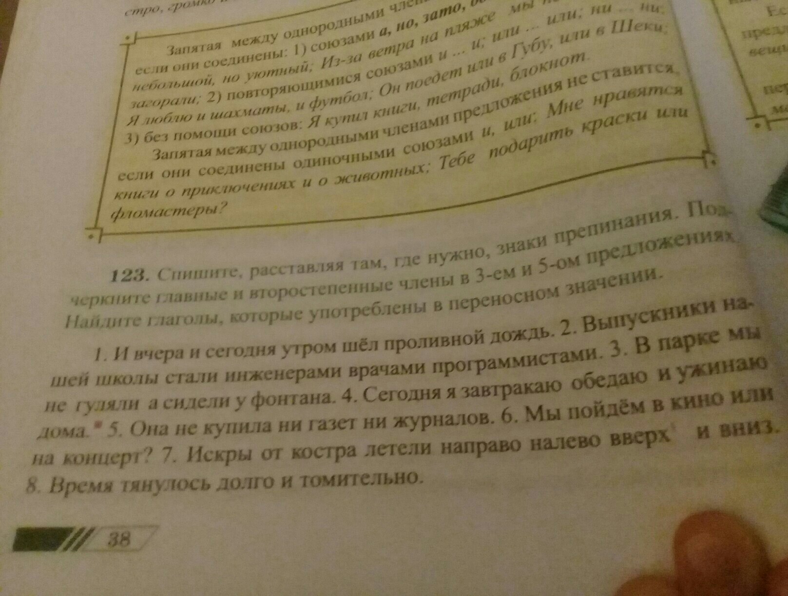 1. И вчера и сегодня, утром шел проливной дождь. 2. Выпускники нашей школы, стали инженерами, врачами, программистами. 3. В парке, мы не гуляли, а сидели у фонтана. 4. Сегодня я завтракаю, обедаю и ужинаю. 5. Она не купила, ни газет, ни журналов. 6. Мы пойдем в кино или на концерт? 7. Искры от костра, летели направо, налево вверх и вниз. 8. Время тянулось долго и томительно.