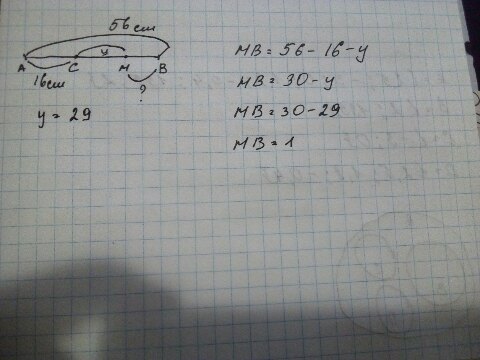 На отрезке АВ отмечена точка С и М так,что точка М лежит между точками С и В.Найдите длину отрезка МВ, если отрезок АВ равен 56см, а отрезок АС =16см, отрезок СМ=у см.Упростите получившееся выражение и найдите его значение при у=29.