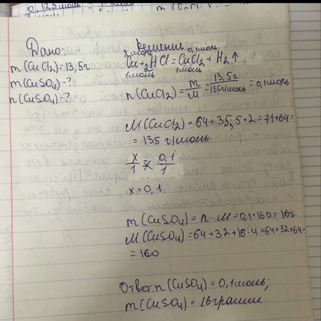 Сколько граммов и сколько моль сульфата меди ( || ) следует взять для получения 13,5 г. хлорида меди ( ||)