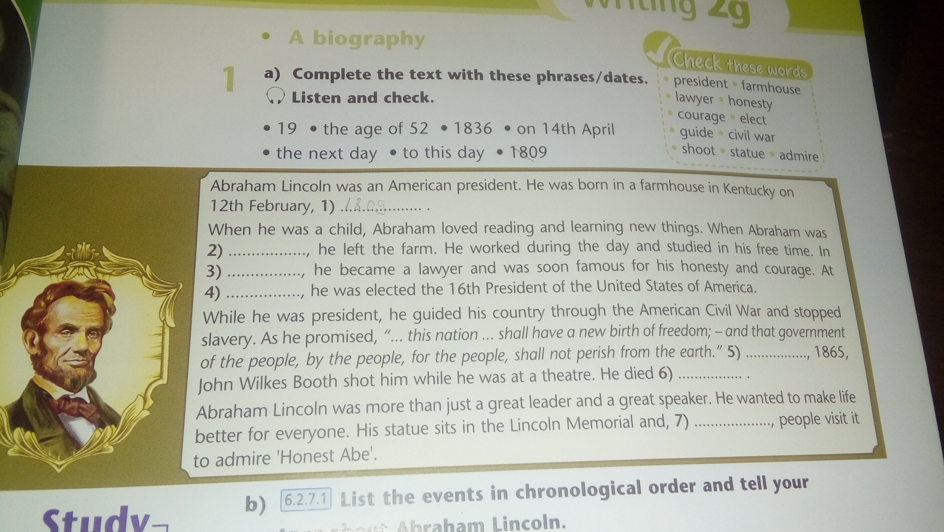 When he was a child, Abraham loved reading and learning new things. When Abraham was 2)19 , he left the farm. He worked during the day and studied in his free time. In 3)1836 , he became a lawyer and was soon famous for his honesty and courage. At 4)the age of 52 , he was elected the 16th President of the United States of America.