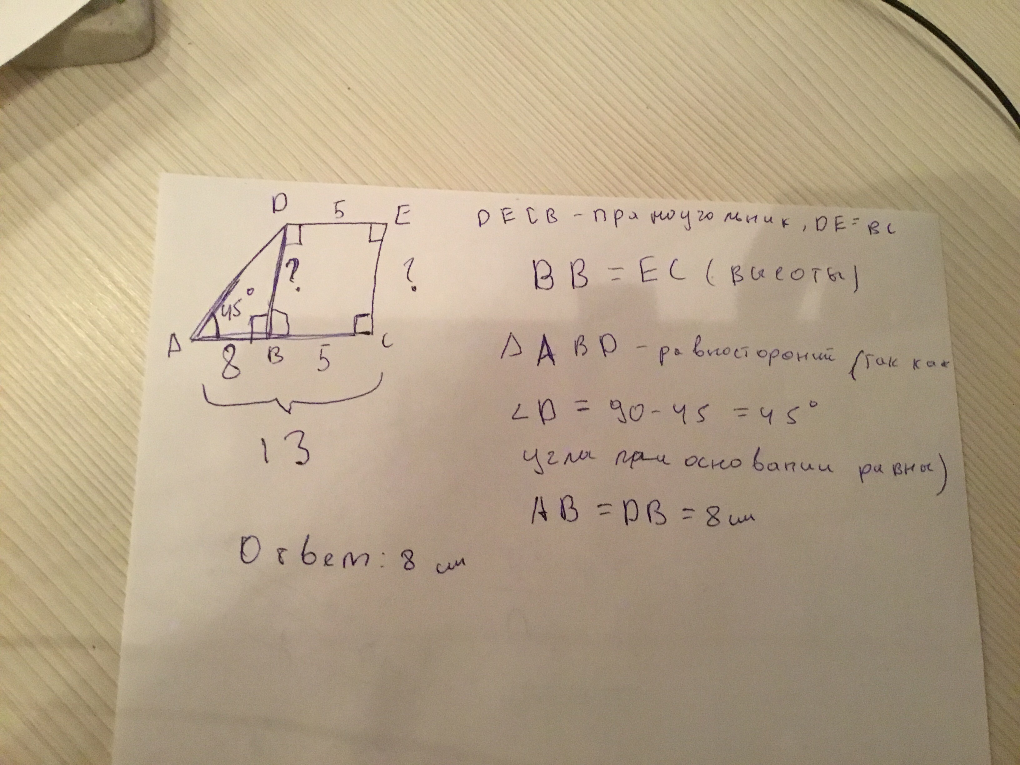 найдите высоты в прямоугольной трапеции если ее острый угол равен 45 градусов а основания 5 и 13