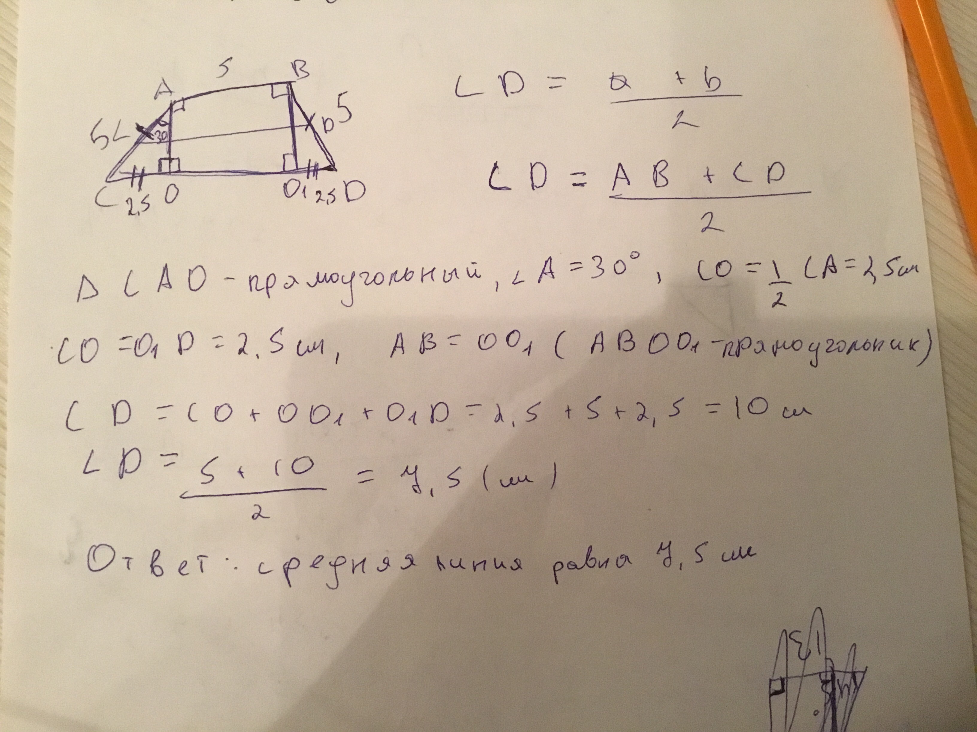 В равнобедренной трапеции меньшее основание равно боковой стороне и равно 5. Высота трапеции образует с боковой стороной угол 30 градусов. Найдите среднюю линию трапеции.
