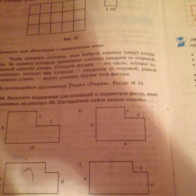 Запишите выражение для площади и периметра фигур, изображенных на рисунке 38. Постарайтесь найти разные способы. ( только в) прошу очень надо!!