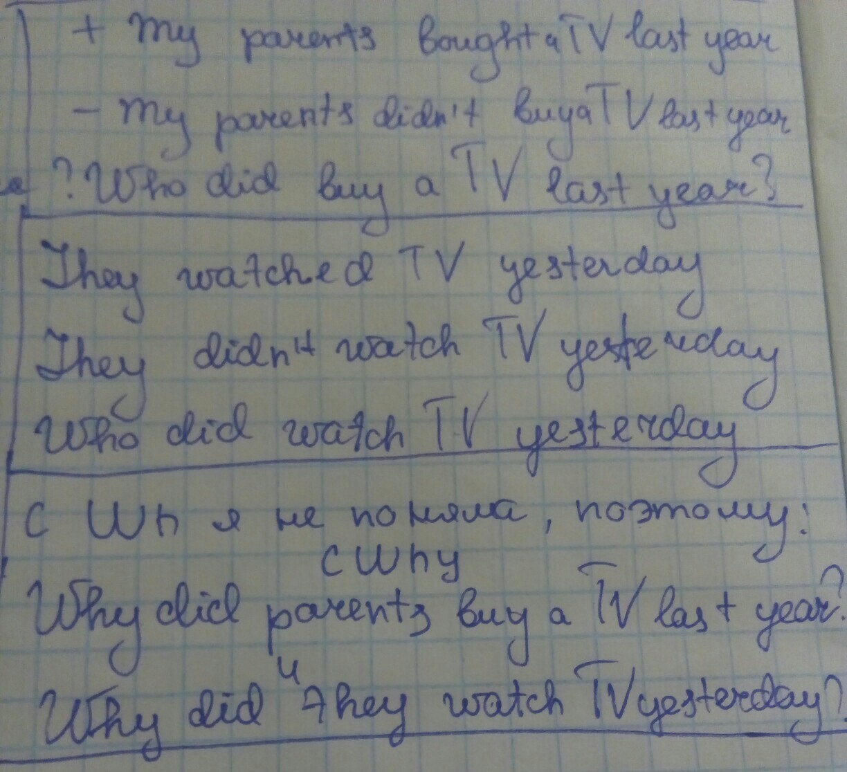 Образуйте: My parents (to buy) last year в положительном и отрицательном, вопроситиельном и на вопросы Wh? и Who?