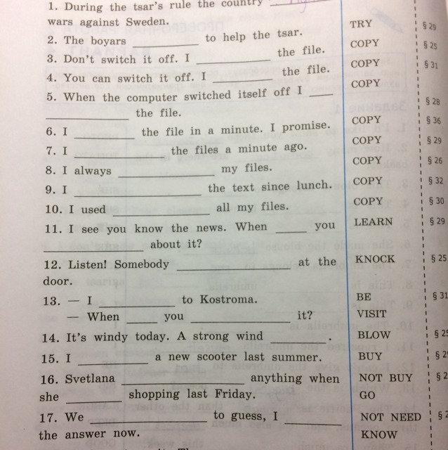 tried, am copying, have just copied, was copying, will copy, copied, copy, have been copying, to copy, did you learn, is knocking, have been, did you visited, is blowing, bought, didn't buy, went, don't need, know.