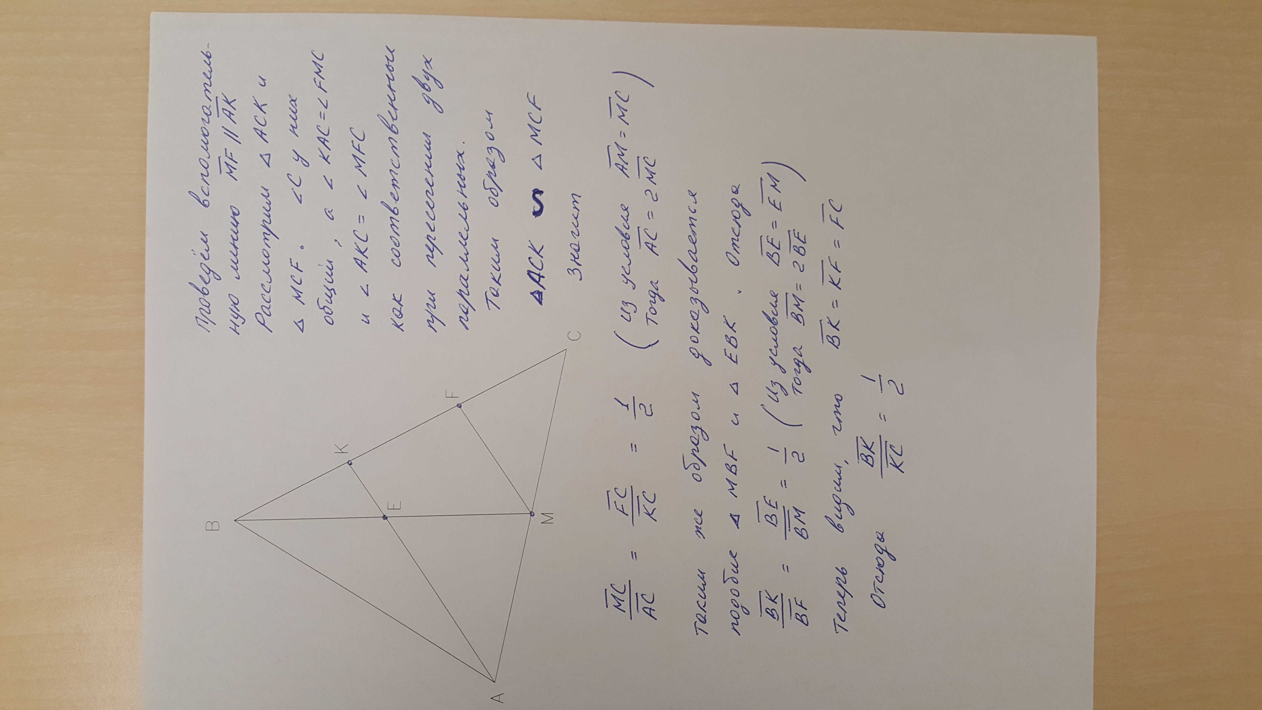 точка Е середина медианы ВМ треугольника АВС. Прямая АЕ пересекает сторону ВС в точке К. Найдите отношение, в котором точка К делит отрезок ВС, учитывая от вершины В.