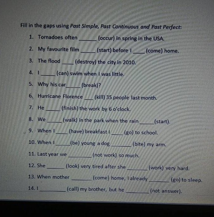 FIll in the gaps using Past Simple, Post Continuous and Past Perfects Tornadoes often(occur) in spring in the USA. 2. My favourite . The flood(destroy) the city in 2010. 4. I(can) swim when I was liftle, s. Why his car(break)? 6, Hurricane Florence(kill) 35 people last month 7. He film Istart) before(come) home (finish) the work by 6 o'clock (walk] in the park when the rain (start) 9. Whenhave breakfact iee) to school. 10. When I(be) young a dog 11. Last year we 12 She (look) very tired after sheworky very hard. 13. When mother (come) home, already 14.1 (bite) my arm. (not work! so much. gol to sleep, (call) my brother, but he Innot answer).httpe 12. SheL (look) very tired after she(work) very hard. 13. When mothe er(come) home, Already(old to sleep. (eal) my brother, but he (not answer 14.1 15. The e-mail (come) some minutes before he 16. He(want) to visit the place where he(live) in his childhood. (not answer). (Beol to work. 17. Mty family and1(walk) at walk) at the beach when the sun EltL (go) down. 18. Where re tbe) you the day before yesterday? 19. The rain (stop) and the sun (shine) brightly
