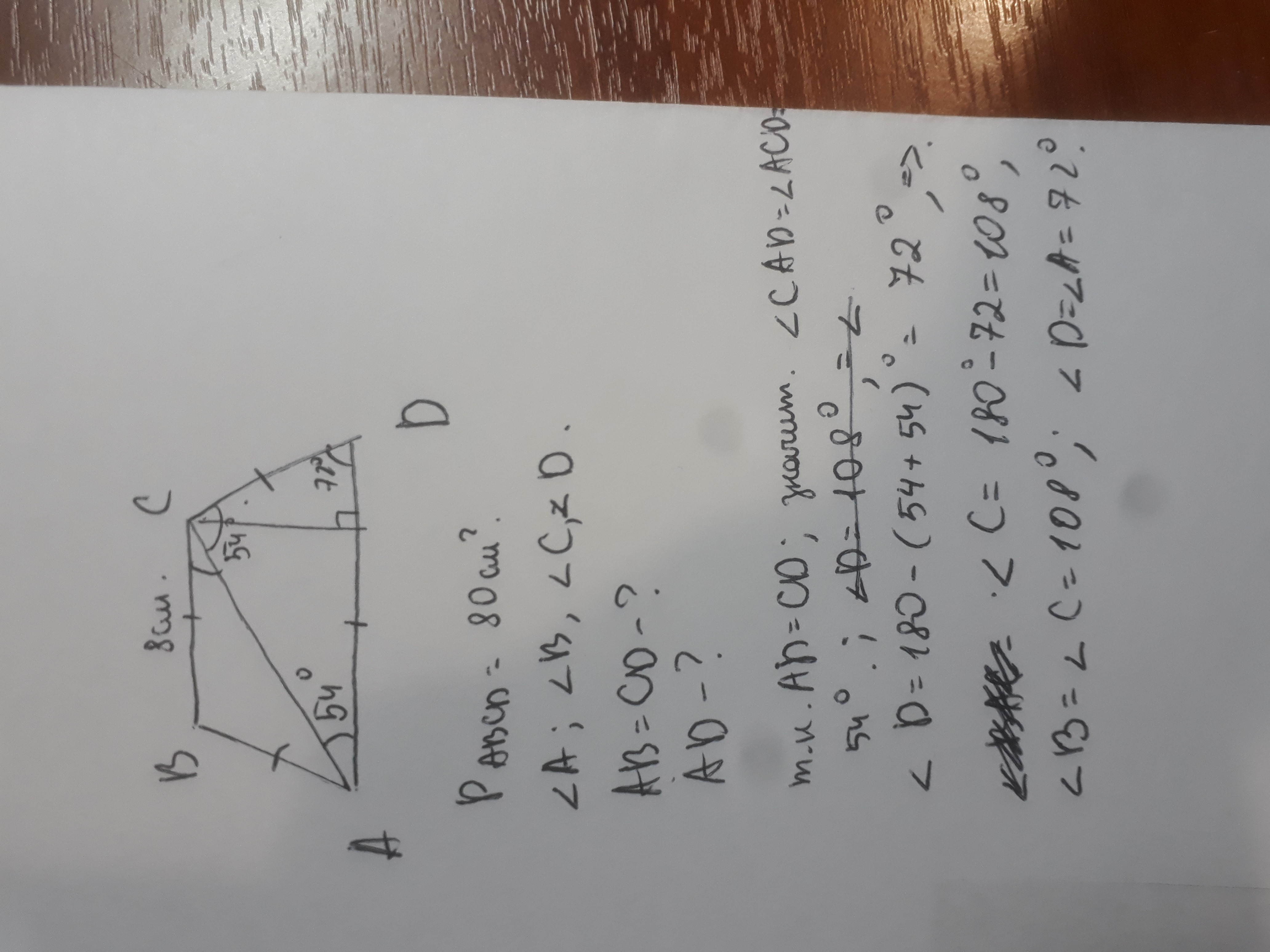 Помогите срочно даю 30баллов, прошу вас!!! Диагональ равнобедренной трапеции образует с основанием угол 54 а её боковая сторона равна большему основанию . Меньшее основание равно 8 см , периметр трапеции 80см найти : 1)углы трапеции 2)боковые стороны и большие основания